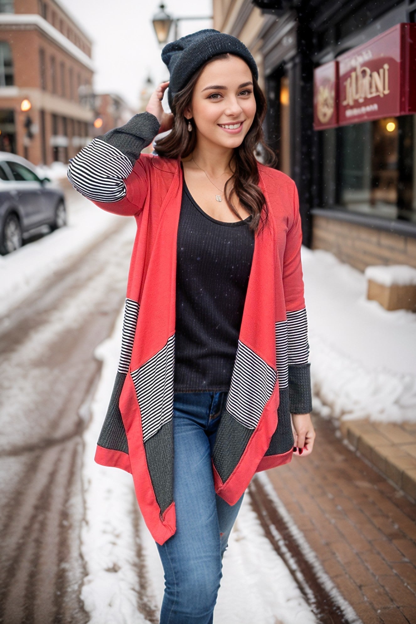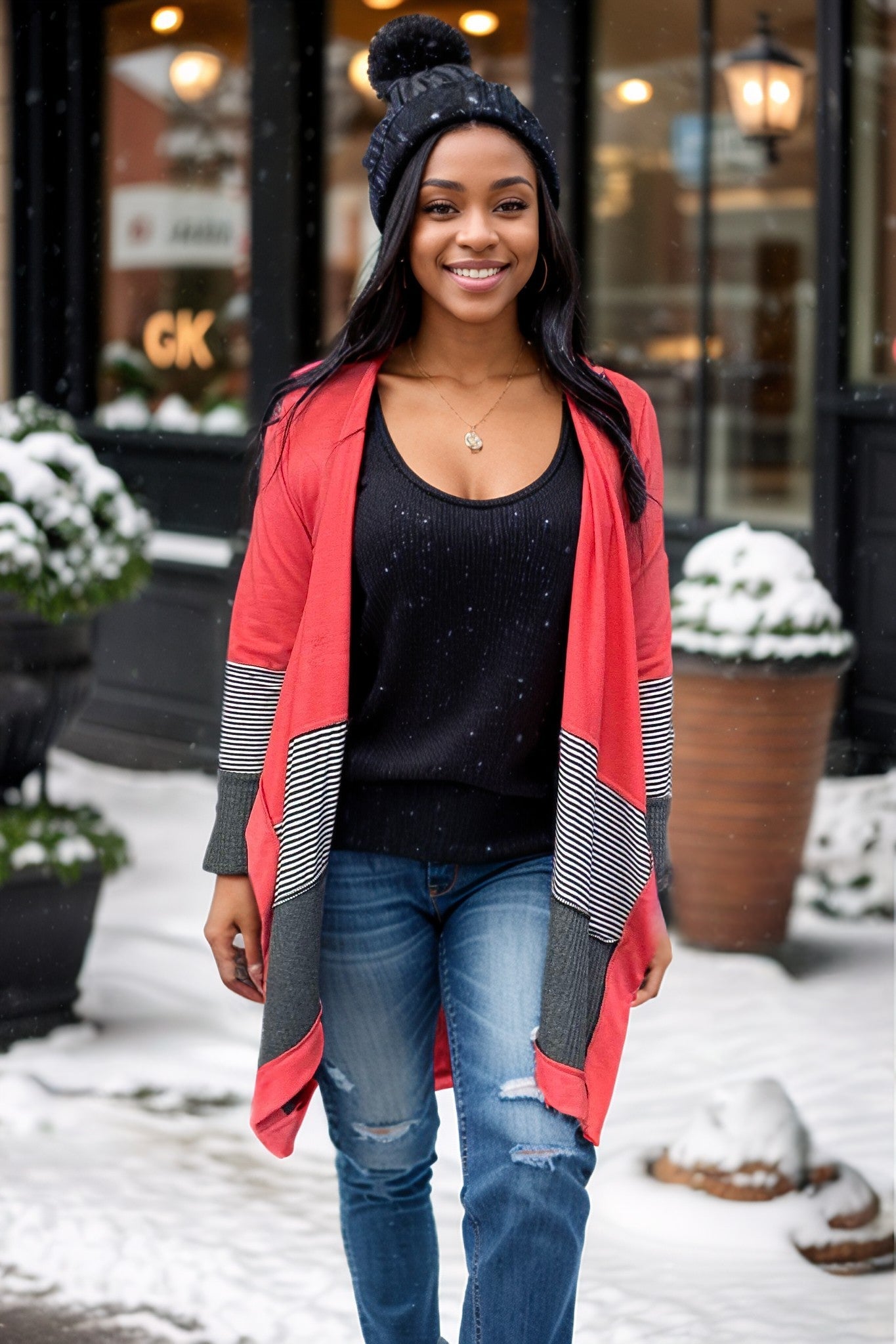 Upgrade your wardrobe with the CoralScapes cardigan! Embrace the playful drape, cascading front, and colorblock design, perfect for layering in any season. With long sleeves and an open face, this cardigan offers versatility and style. The solid and stripe contrast adds a touch of quirk and uniqueness. (Get ready for compliments!)