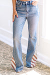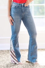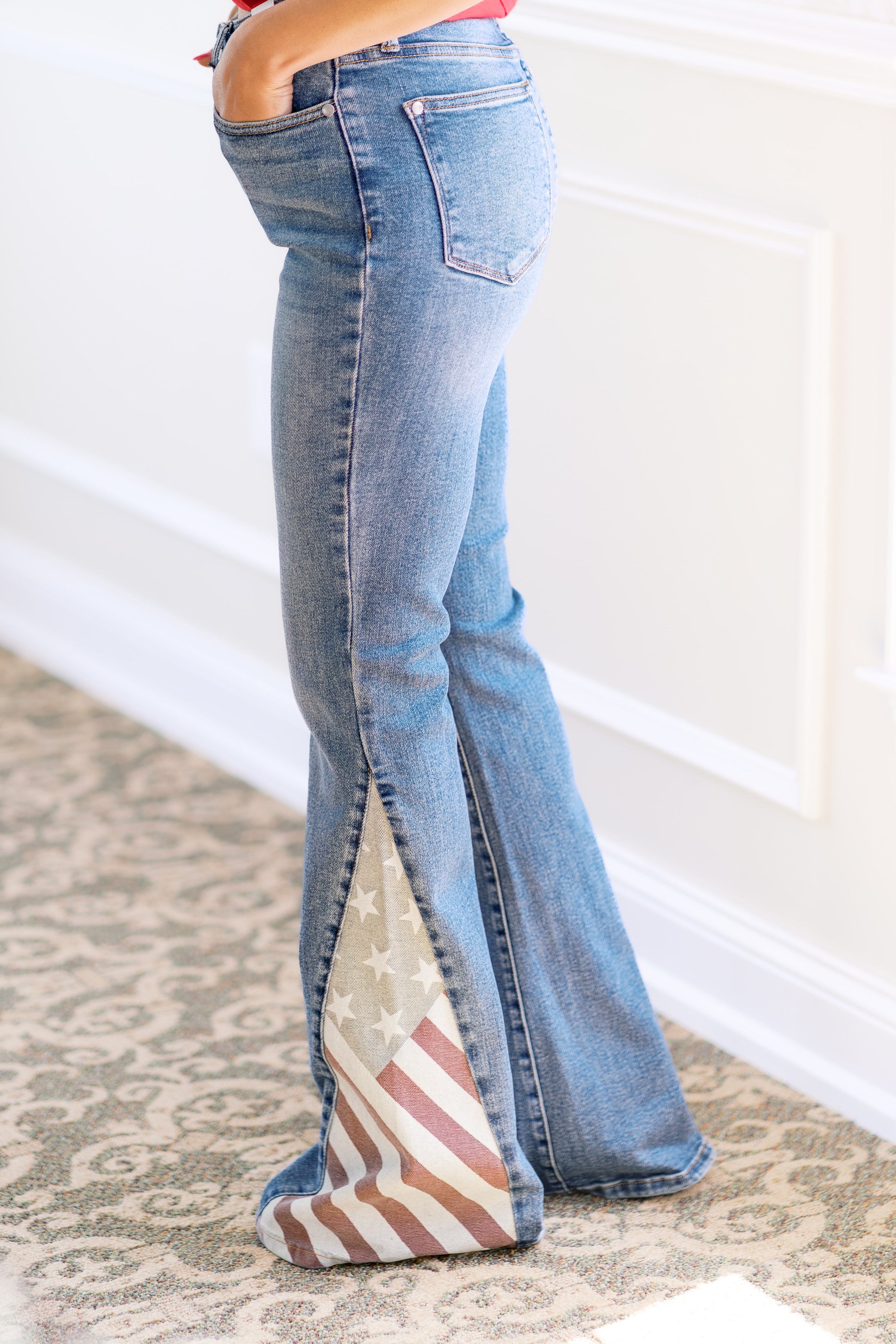 Embrace your freedom with our Freedom Rings Judy Blues! These American flag flares not only make a statement, but also provide a comfortable and stylish fit. Show off your patriotic spirit with a touch of flair.