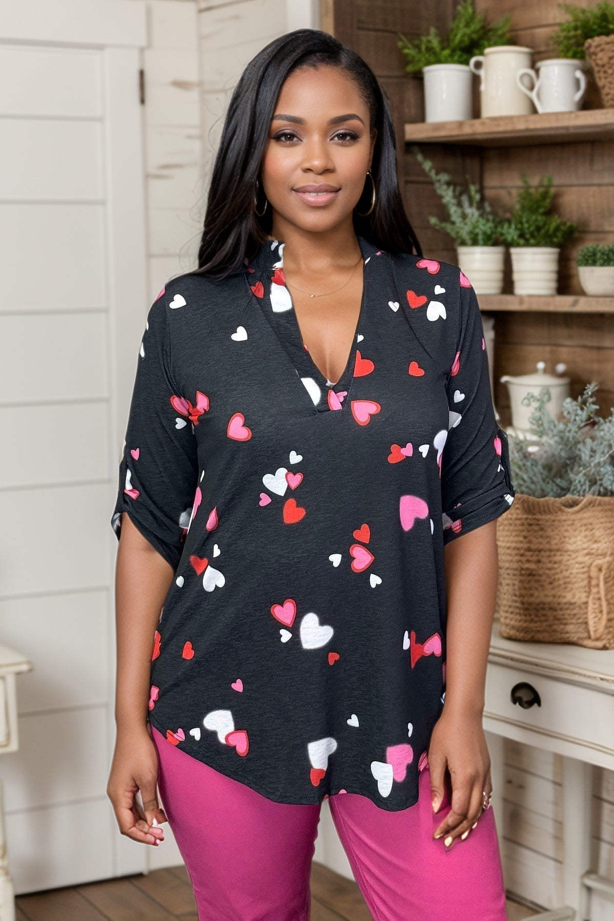 Effortlessly chic with A Million Hearts Gabby relaxed fit, three quarter sleeves and mandarin collar make it perfect for any occasion. The v-neck adds a touch of elegance, while the heart print on luxurious Bulgari fabric shows off your playful side. Spread the love!