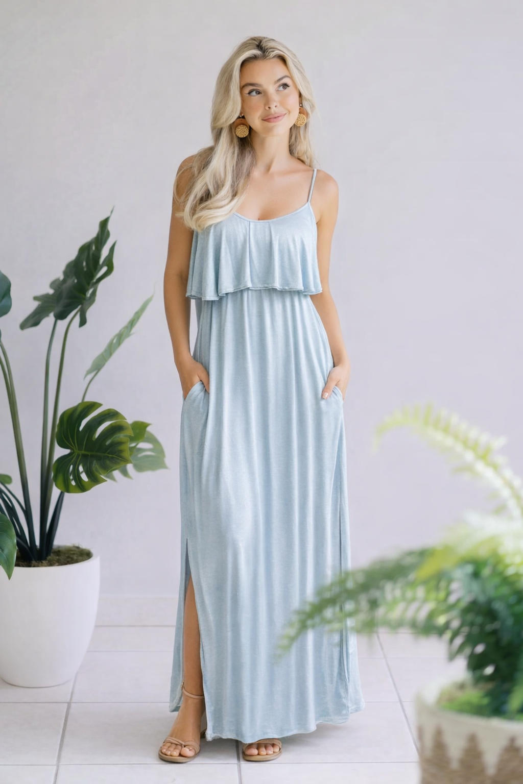 Get ready to turn heads in this Dusty Mint Maxi dress! Featuring a playful ruffle tiered bodice and spaghetti straps with a unique criss cross detail in the back, this maxi is both stylish and functional. With the added convenience of side pockets and side slits, you'll feel confident and comfortable all day long.