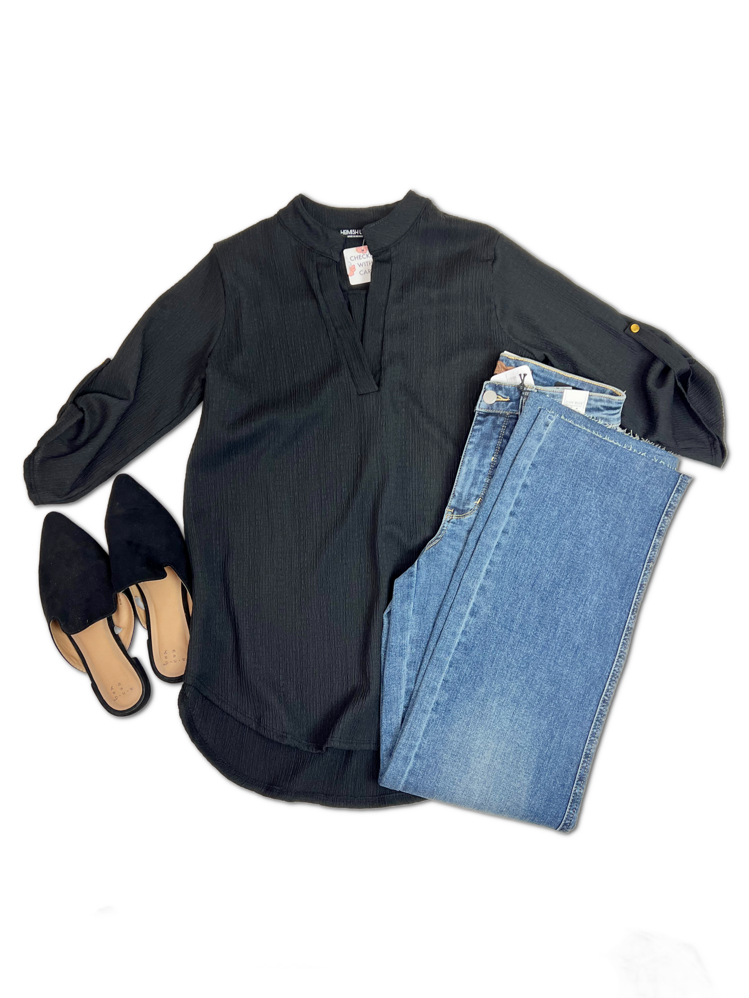 Get ready for nights like no other in our Nights Like This Top! Featuring a roll-up 3/4 sleeve, v-neck, and mandarin collar, this solid colored top will add a touch of style to any ensemble. Perfect for a fun night out!