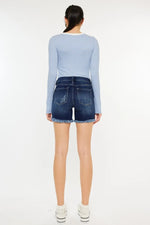 These premium denim shorts feature a flattering high-rise silhouette with a fashion button fly closure. Made from quality stretch denim in a versatile medium-dark wash, these shorts offer both style and comfort. The raw hem with frayed details adds a casual, lived-in look while the classic 5-pocket design maintains timeless appeal. Light distressing throughout creates dimension and character. The mid-thigh length and fitted cut through hip and thigh creates a balanced, feminine silhouette perfect for warm weather styling.