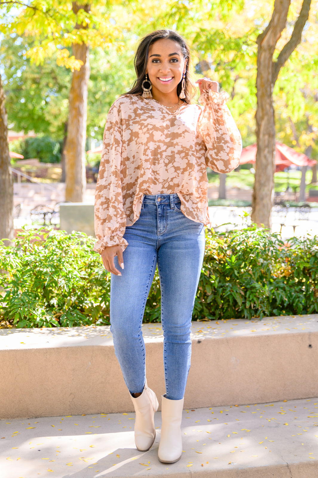 Modern and minimalist, this at ease blouse has a sleek tie-neck, sheer floral designed fabric in a gorgeous mix of pink and tan. Perfect for layering underneath a blazer for a workday look!