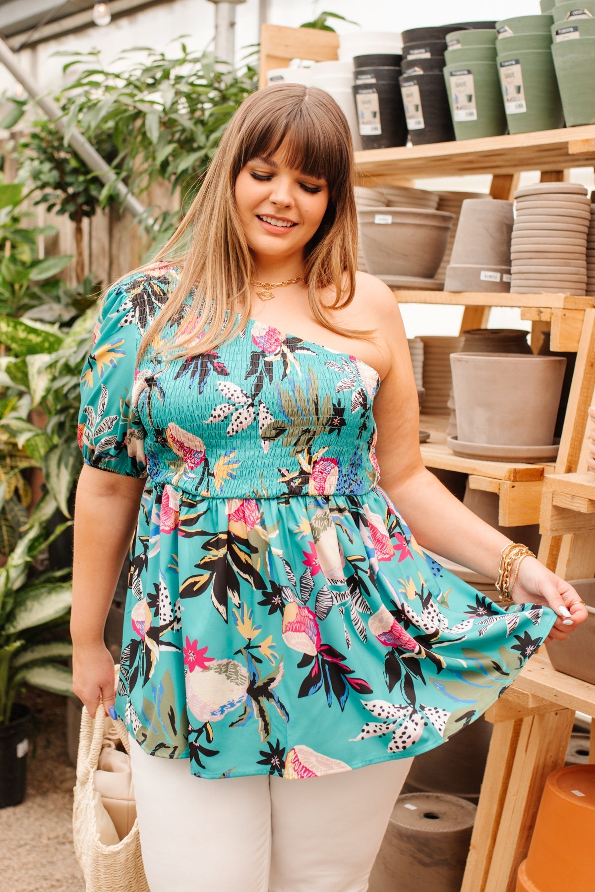 Say goodbye to your basic summer tops with the Day Trip Blouse! An adorable one shoulder silhouette falls into a shirred bust, and peplum style bodice, with a puff sleeve elasticated at the cuff. Style this bold top with white skinnies, sunnies, nude sandals, and bright accessories for a fun resort inspired look!